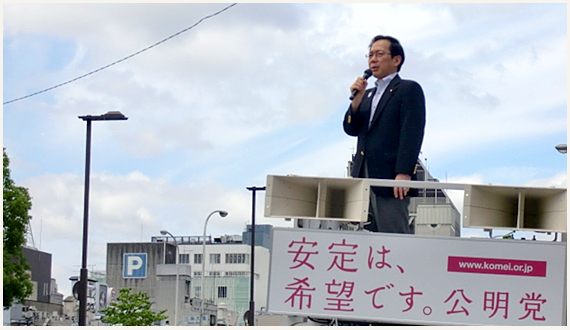 また、公明党は、平和の党として近隣諸国との関係改善や、連立政権のブレーキ役として、国民が求める政治の安定を担っていくと述べ、公明党への絶大なる支援を訴えた。